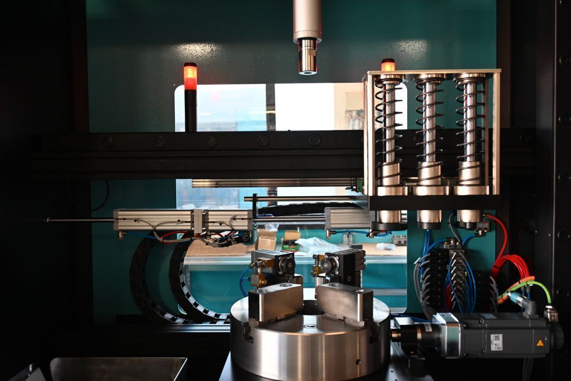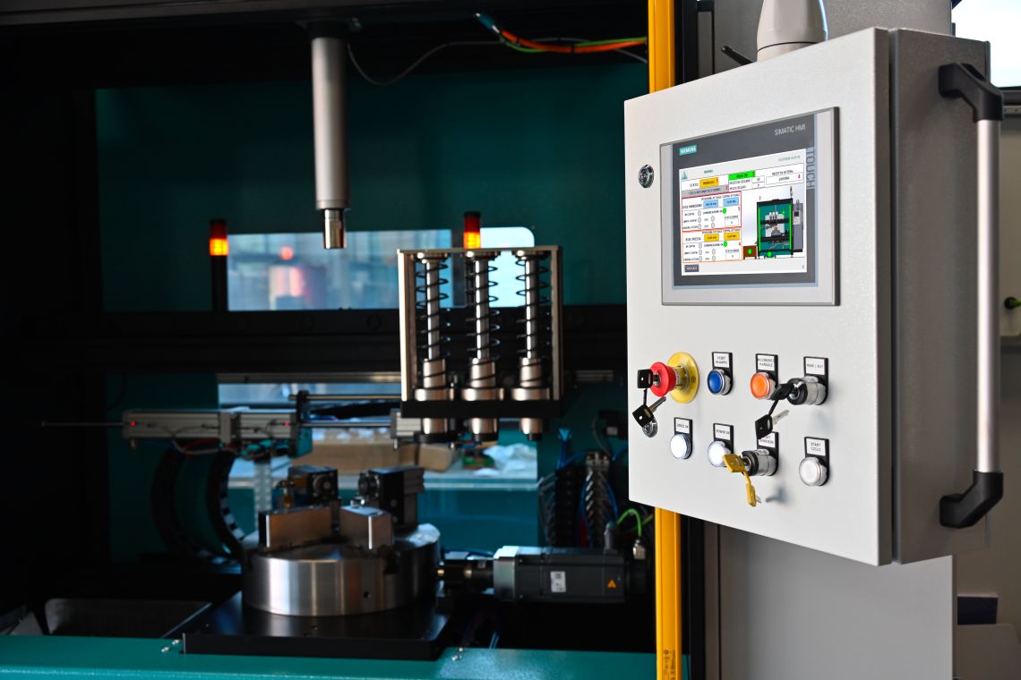 The clamp automatically closes to the selected diameter, keeping the spin pack stable during the opening phase.